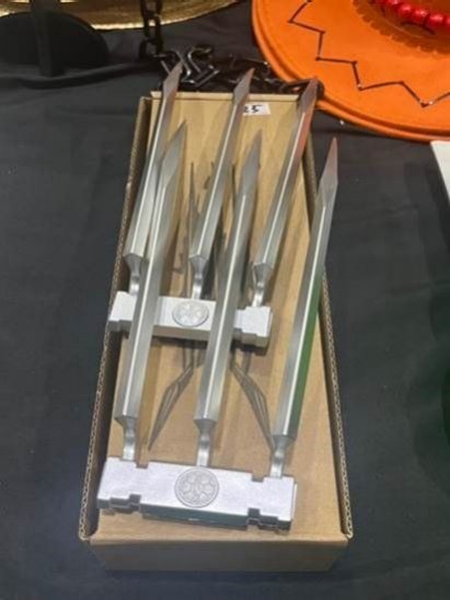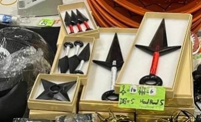 - Metal or wooden blades, whether sharp or blunt, including but not limited to swords, axes, kunai, throwing stars, ice skates, and knives of any kind; This includes “ninja swords”, which are prohibited under Ronan’s Law (2025) and may not be sold, displayed, or offered even as collectibles.